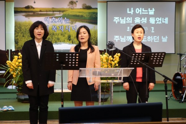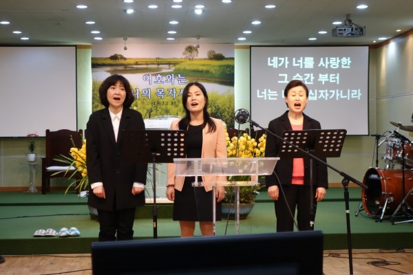 오후예배에서 특송이 있었습니다. ( 왼쪽부터 김현정 집사님, 이선화 집사님, 박정희 권사님) -할렐루야 찬양단
