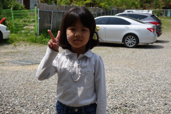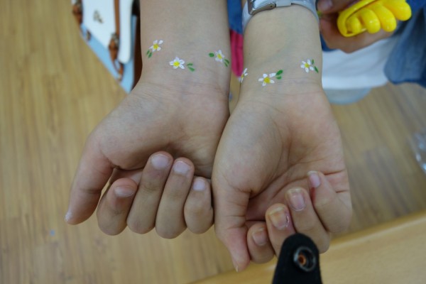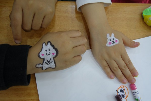 아이들 얼굴과 손에 귀여운 그림들이 보이시나요?